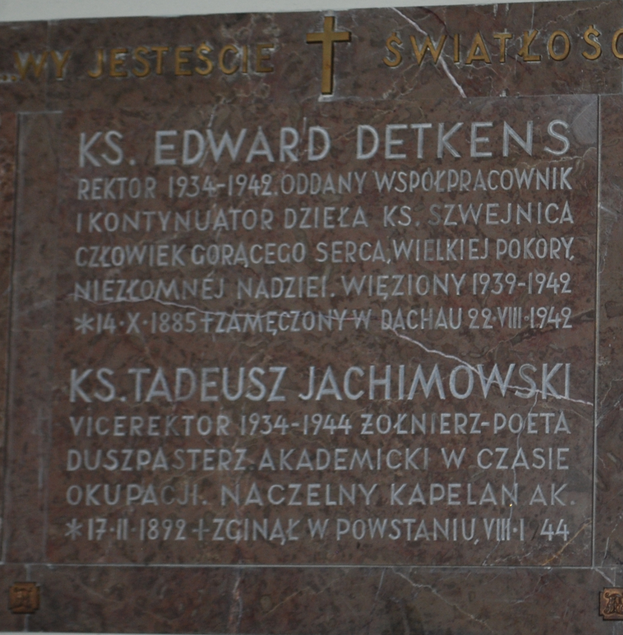 Ks. Detkens wiedział, że w Baderaum pracuje jeden Polak. Był to ks. S. Stachowicz Nr 22697. Diecezja Lublin. Jakimś szczęśliwym zrządzeniem losu dostał się do komanda pracującego pod dachem. Do niego należało spłukiwanie i mycie podłogi po kąpiących się. […] On to miał dać znać ks. Detkensowi o drugim znaku. Gdy ks. Detkens wszedł do Badereum, zobaczył, że idzie do niego ks. Stachowicz. Miał w ręku wiadro i szczotkę. Podszedł prędko do ks. Detkensa i szepnął: