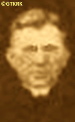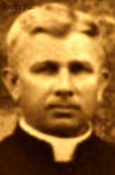After the German and Russian invasion of Poland in 09.1939 and the beginning of World War II, the Germans entered his Kębłów parish on 03.09.1939. Was not there — it was Sunday and was celebrating Holy Mass in a school in Wroniary, c. 4 km away — when the Germans searched the church and the rectory, looking for a machine gun, which was ceremonially presented to the Polish Border Guard on 15.08.1939 with his participation. It was not found, but a photo of him in the uniform of a Polish Army chaplain from 1920 was discovered instead. When returned to Kłębów, was promptly by the Germans arrested.