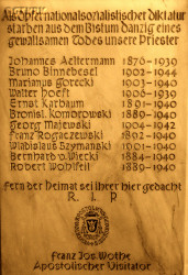 KL Stutthof: In German Germ. Konzentrationslager (Eng. concentration camp) KL Stutthof (then in Eastern Prussian belonging to Germany, today: Sztutowo village) concentration camp, that Germans started to build on 02.09.1939, a day after German invasion of Poland and start of the World War II, Germans held c. 110,000‐127,000 prisoners from 28 countries, including 49,000 women and children. C. 65,000 victims were murdered and exterminated. In the period of 25.01‐27.04.1945 in the face of approaching Russian army Germans evacuated the camp. When on 09.05.1945 Russians soldiers entered the camp only 100 prisoners were still there. In an initial period (1939‐1940) Polish Catholic priests from Pomerania were held captive there before being transported to KL Dachau concentration camp. Some of them were murdered in KL Stutthof or vicinity (for instance in Stegna forest). Also later some Catholic priests were held in KL Stutthof. (more on: stutthof.orgClick to attempt to display webpage