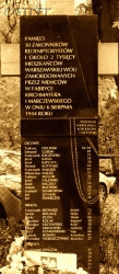 Wola district massacres: Mass extermination of the inhabitants of Warsaw Wola and Ochota districts, perpetrated by the Germans in the first days of Warsaw Uprising. Approx. 38,000‐65,000 Poles, men, women and children were massacred (the peak of the barbarian killings took place on 05‐07.08.1944). The massacre — genocide in fact — was in direct response to Adolf Hitler’s order to crash and destroy Warsaw and kill all of its citizens and was perpetrated by German SS units and Russian SS RONA units (with Belarusian contingent) collaborating with them. (more on: pl.wikipedia.orgClick to attempt to display webpage