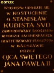 KL Stutthof: W niemieckim niem. Konzentrationslager (pl. obóz koncentracyjny) KL Stutthof (ówcześnie na terenie Wschodnich Prus należących do Niemiec, dziś: wieś Sztutowo), którego budowę rozpoczęto 02.09.1939, w dzień po niemieckim ataku na Polskę i rozpoczęciu II wojny światowej, Niemcy przetrzymywali razem ok. 110,000‐127,000 osób pochodzących z 28 krajów, w tym 49,000 kobiet i dzieci. Zamordowali ok. 65,000 osób. W dniach 25.01‐27.04. 1945, wobec nacierającej armii rosyjskiej, Niemcy przeprowadzili ewakuację obozu. 09.05.1945, gdy na teren obozu wtargnęli żołnierze rosyjskim, było w nim tylko 100 więźniów. W początkowym okresie (1939‐1940) w KL Stutthof przetrzymywano księży z obszaru Pomorza, by później wysłać ich do obozu koncentracyjnego KL Dachau. Część została zamordowana już w KL Stutthof lub okolicy (na przykład w lesie Stegna). Także w późniejszym czasie wśród więźniów pojawiali się duchowni. (więcej na: www.stutthof.plKliknij by spróbować wyświetlić stronę
