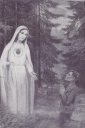 Następnie tablica opadła ku ziemi tworząc obłok w kształcie dzwonu. Nad nim pojawił się świetlisty trójkąt, w którego środku znajdował się Nasz Zbawiciel w Chwale, nieskończony, z twarzy podobny do Matki… Ubrany w długą, białą szatę, przepasaną na barku czerwonym płótnem, w lewej ręce trzymał krzyż, a prawą wskazywał na Swoje serce. Z serca Jezusowego promieniowały trzy strzały światła, z których jedna, środkowa, strzeliła w stronę Mateusza i przebiła go.