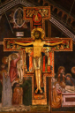 Na ikonie z kościółka św. Damiana obok Ukrzyżowanego Chrystusa przedstawieni są świadkowie ukrzyżowania: Maryja, Jan Apostoł i Ewangelista, Maria Magdalena, Maria matka Jakuba oraz setnikpor. Mk 15, 38, a także tzw. świadkowie mniejsi: Longinus, żołnierz, który miał przebić bok Chrystusowi, i Stephaton, inny rzymski żołnierz, którzy miał podać Chrystusowi gąbkę nasączoną octem. Artysta przedstawił również obserwatora, w którym być może chciał uwiecznić samego siebie. Na ikonie widnieją również postacie aniołów, świętych patronów oraz prawa ręka Boga Ojca. Natomiast na desce górnej przedstawione jest zmartwychwstanie ciał…