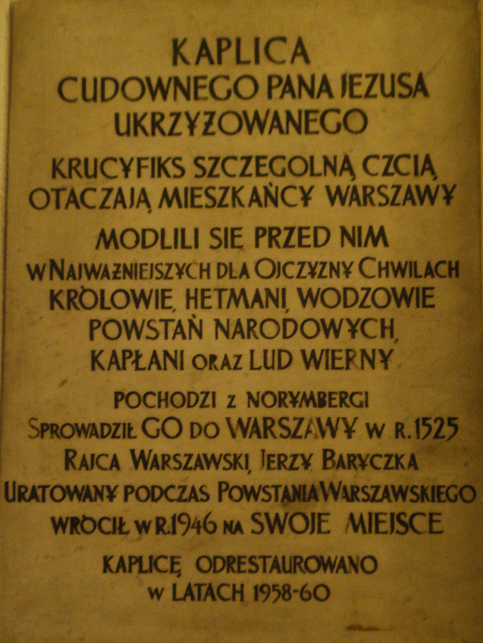 W 1639 r. Krucyfiks przeniesiono do nowego ołtarza bocznego, ufundowanego po huraganie przez wspomniany ród Baryczków. Wtedy to, w związku z poświęceniem kaplicy 16.ii.1639 r. przez Andrzeja Szołdrskiego (ok. 1583 – 1650, Poznań?), biskupa poznańskiego (Warszawa należała wówczas do diecezji poznańskiej), zapisano w aktach, że Figura Chrystusa pierwotnie znajdować się miała w kościele katedralnym w Norymberdze: „Miasto Norymberga, znane z handlu, miało w kościele katedralnym ten zabytek religijny. W czasie reformacji skazany był razem z innymi obrazami na spalenie: znajdujący się tam wówczas w interesie handlowym Jerzy Baryczka, rajca Warszawy, ocalił krzyż z wyobrażeniem, kazał rozebrać na części, aby łatwiej do Warszawy sprowadzić i w przyzwoitym złożyć je miejscu”…