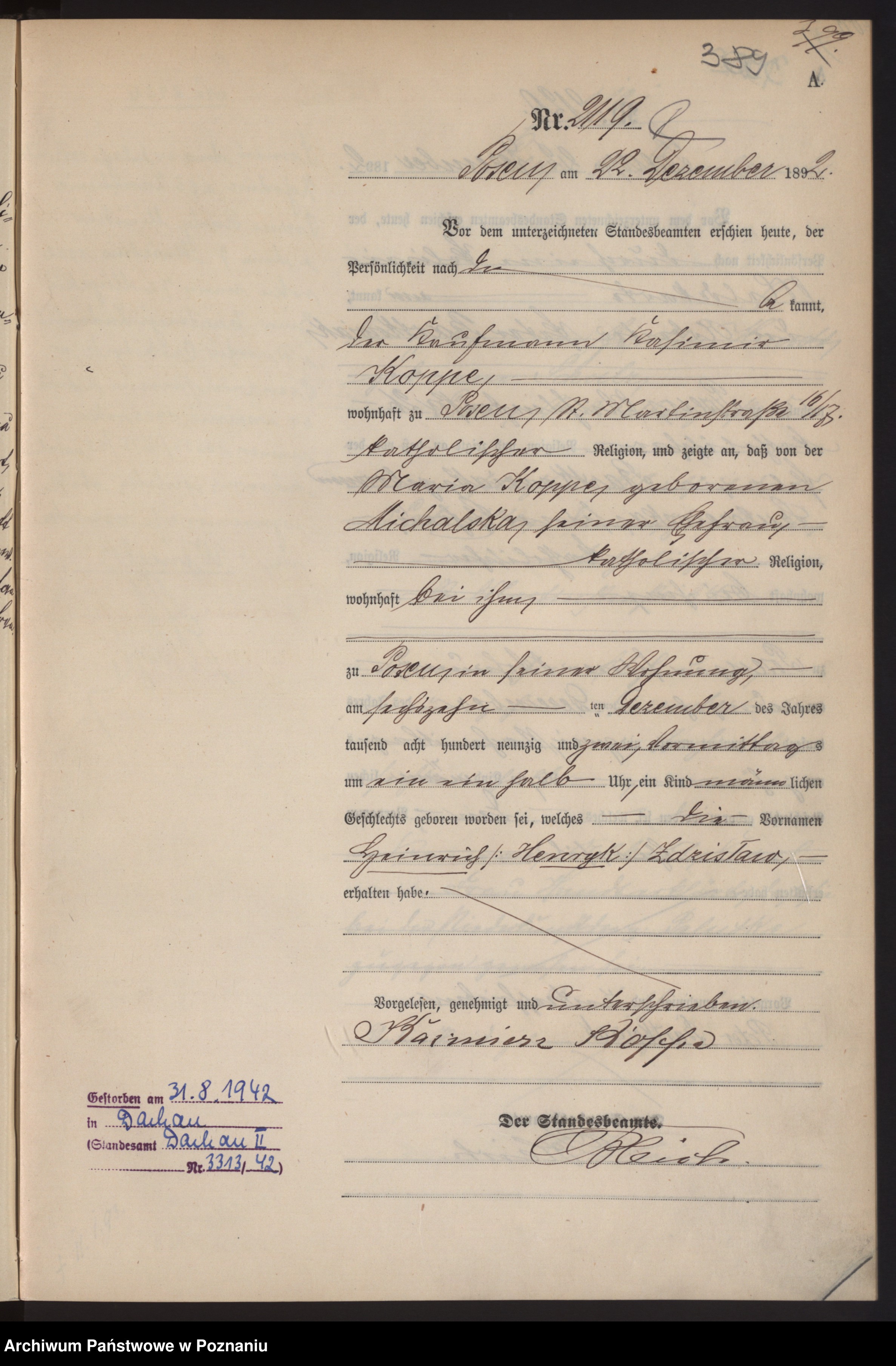 According to the death certificate, prepared in KL Dachau, the „honest” otherwise German „medical doctors” and formalists — and at the same time, unrivaled fairy tale spinners — noted that the cause of death was Germ. „Versagen von Herz und Kreislauf, bei Darmkatarrch” (Eng. „Heart and circulatory failure, due to intestinal catarrh”).