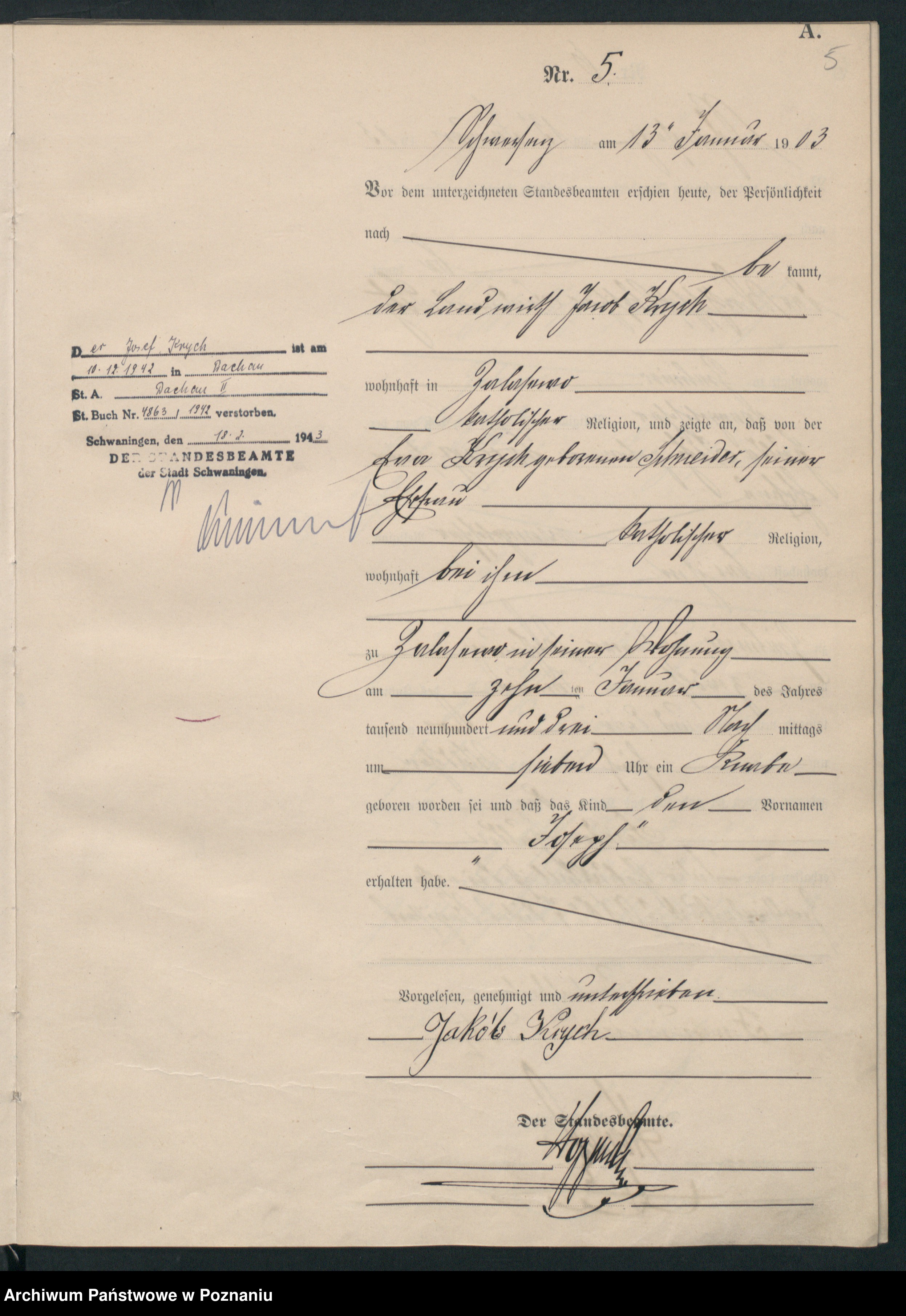 Reichsgau Wartheland: After the Polish defeat in the 09.1939 campaign, which was the result of the Ribbentrop‐Molotov Pact and constituted the first stage of World War II, and the beginning of German occupation in part of Poland (in the other, eastern part of Poland, the Russian occupation began), the Germans divided the occupied Polish territory into five main regions (and a few smaller). The largest one was transformed into Germ. Generalgouvernement (Eng. General Governorate), intended exclusively for Poles and Jews and constituting part of the so‐called Germ. Großdeutschland (Eng. Greater Germany). Two were added to existing German provinces. From two other separate new provinces were created. Greater Poland region was one of them, incorporated into Germany on 08.10.1939, by decree of the German leader Adolf Hitler (formally came into force on 26.10.1939), and on 24.01.1940 transformed into the Germ. Reichsgau Wartheland province, in which the law of the German state was to apply. The main axis of the policy of the new province, the territory of which the Germans recognized as the Germ. „Ursprünglich Deutsche” (Eng. „natively German”), despite the fact that 90% of its inhabitants were Poles, was Germ. „Entpolonisierung” (Eng. „Depolonisation”), i.e. forced Germanization. C. 100,000 Poles were murdered as part of the Germ. „Intelligenzaktion”, i.e. extermination of Polish intelligentsia and ruling classes. C. 630,000 were forcibly resettled to the Germ. Generalgouvernement, and their place taken by the Germans brought from other areas occupied by Germany (e.g. the Baltic countries, Bessarabia, Bukovina, etc.). Poles were forced to sign the German nationality list, the Germ. Deutsche Volksliste DVL. As part of the policy of „Ohne Gott, ohne Religion, ohne Priesters und Sakramenten” (Eng. „No God, no religion, no priest or sacrament”) most Catholic priests were arrested and sent to concentration camps. All schools teaching in Polish, Polish libraries, theaters and museums were closed. Polish landed estates confiscated. To further reduce the number of the Polish population, Poles were sent to forced labor deep inside Germany, and the legal age of marriage for Poles was increased (25 for women, 28 for men). The German state office, Germ. Rasse‐ und Siedlungshauptamt (Eng. Main Office of Race and Settlement) RuSHA, under the majesty of German law, abducted several thousand children who met specific racial criteria from Polish families and subjected them to forced Germanization, handing them over to German families. After the end of hostilities of World War II, the overseer of this province, the Germ. Reichsstatthalter (Eng. Reich Governor) and the Germ. Gauleiter (Eng. district head) of the German National Socialist Party, Arthur Karl Greiser, was executed. (more on: en.wikipedia.orgClick to attempt to display webpage