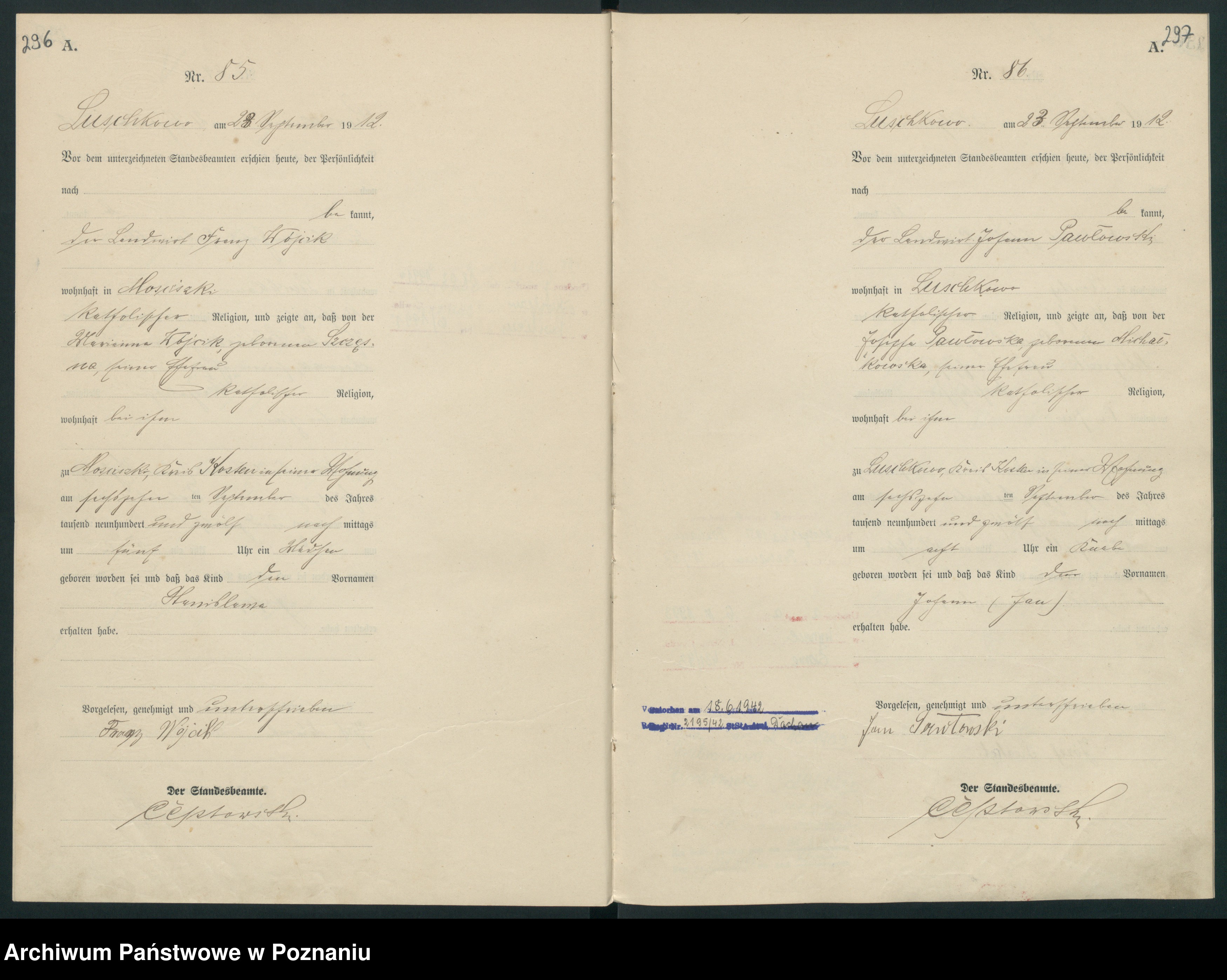 Reichsgau Wartheland: After the Polish defeat in the 09.1939 campaign, which was the result of the Ribbentrop‐Molotov Pact and constituted the first stage of World War II, and the beginning of German occupation in part of Poland (in the other, eastern part of Poland, the Russian occupation began), the Germans divided the occupied Polish territory into five main regions (and a few smaller). The largest one was transformed into Germ. Generalgouvernement (Eng. General Governorate), intended exclusively for Poles and Jews and constituting part of the so‐called Germ. Großdeutschland (Eng. Greater Germany). Two were added to existing German provinces. From two other separate new provinces were created. Greater Poland region was one of them, incorporated into Germany on 08.10.1939, by decree of the German leader Adolf Hitler (formally came into force on 26.10.1939), and on 24.01.1940 transformed into the Germ. Reichsgau Wartheland province, in which the law of the German state was to apply. The main axis of the policy of the new province, the territory of which the Germans recognized as the Germ. „Ursprünglich Deutsche” (Eng. „natively German”), despite the fact that 90% of its inhabitants were Poles, was Germ. „Entpolonisierung” (Eng. „Depolonisation”), i.e. forced Germanization. C. 100,000 Poles were murdered as part of the Germ. „Intelligenzaktion”, i.e. extermination of Polish intelligentsia and ruling classes. C. 630,000 were forcibly resettled to the Germ. Generalgouvernement, and their place taken by the Germans brought from other areas occupied by Germany (e.g. the Baltic countries, Bessarabia, Bukovina, etc.). Poles were forced to sign the German nationality list, the Germ. Deutsche Volksliste DVL. As part of the policy of „Ohne Gott, ohne Religion, ohne Priesters und Sakramenten” (Eng. „No God, no religion, no priest or sacrament”) most Catholic priests were arrested and sent to concentration camps. All schools teaching in Polish, Polish libraries, theaters and museums were closed. Polish landed estates confiscated. To further reduce the number of the Polish population, Poles were sent to forced labor deep inside Germany, and the legal age of marriage for Poles was increased (25 for women, 28 for men). The German state office, Germ. Rasse‐ und Siedlungshauptamt (Eng. Main Office of Race and Settlement) RuSHA, under the majesty of German law, abducted several thousand children who met specific racial criteria from Polish families and subjected them to forced Germanization, handing them over to German families. After the end of hostilities of World War II, the overseer of this province, the Germ. Reichsstatthalter (Eng. Reich Governor) and the Germ. Gauleiter (Eng. district head) of the German National Socialist Party, Arthur Karl Greiser, was executed. (more on: en.wikipedia.orgClick to attempt to display webpage