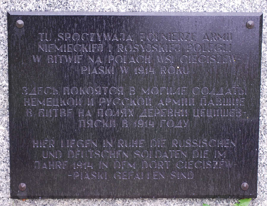 Na cmentarzyku w Cieciszewie natomast znajduje się tylko kamień z płytą z napisami po polsku, rosyjsku i niemiecku. Napisy świadczą, że pochowane są tam też szczątki walczących Czy byli wśród nich Polacy? Nie wiadomo…