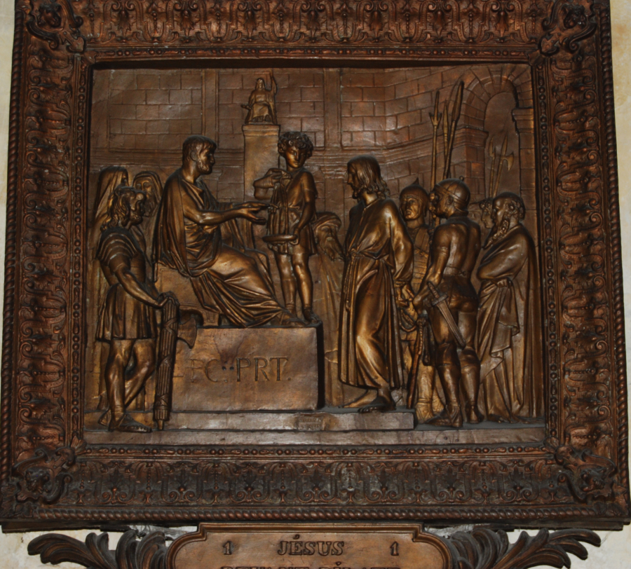 Piłat, nie znajdując szczególnej winy, którą można by przypisać Jezusowi, ulega presji oskarżycieli i w ten sposób Nazarejczyk zostaje skazany na śmierć.