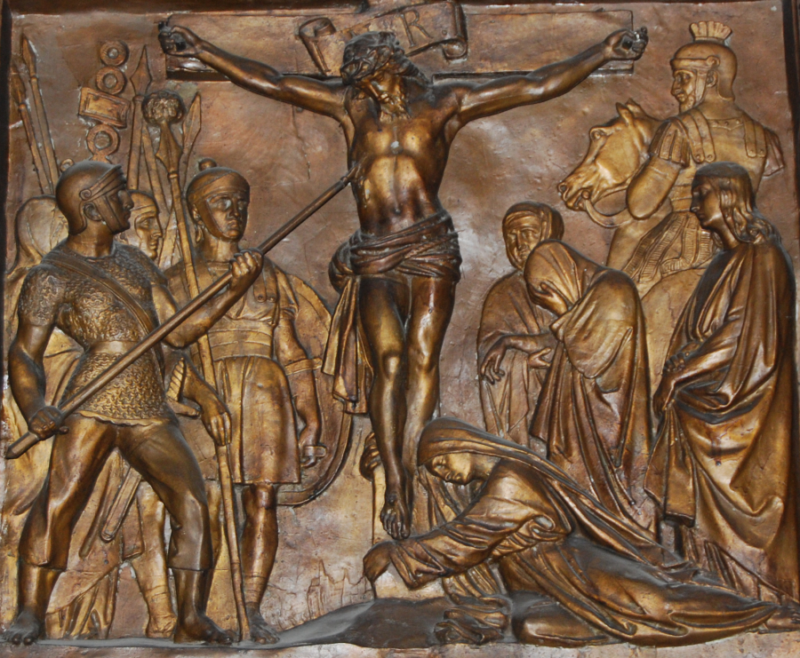 Po przybyciu na miejsce, zwane „Kalwarią”, żołnierze ukrzyżowali Jezusa. Piłat napisał: „Jezus Nazarejczyk, Król żydowski”, aby Go wyśmiać, a Żydów upokorzyć. Ale, wbrew intencjom Piłata, ten napis okazał się prawdziwy: królowanie Jezusa, króla w Królestwie, które nie ma ranic, ani przestrzeni, ani czasu.